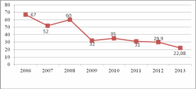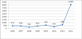 Российские прямые инвестиции в Китае традиционно характеризуются весьма скромными показателями. Так, в 2013 г., по данным Минкоммерции КНР, они составили 22,08 млн. долл. против 29,92 млн. долл. в 2012 г. (-26,2%). К началу 2014 г. суммарный объем российских прямых инвестиций в Китай достиг 869,79 млн. долл.(рисунок 2.6).