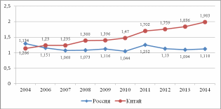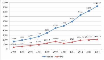 Рисунок 2.6 ВВП России и Китай за период 2004-2014 гг., (млрд. долл.)9