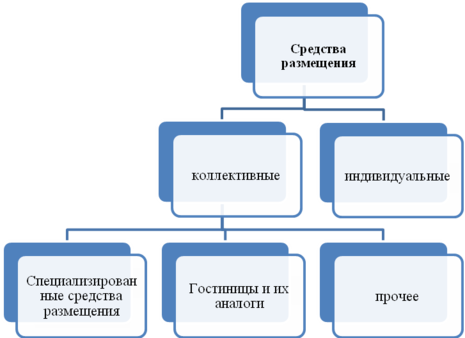 Традиционно средства размещения делятся на коллективные и индивидуальные. Среди коллективных средств размещения наибольшая доля приходится на гостиницы.