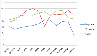 Как видно из Рис 2.10у гостиницы «Версаль»в 2014 году самая низкая заполняемость по сравнению с другими двумя гостиницами города Белогорска.Самый высокий коэффициент заполняемости гостиницы приходится на июль и достигает 42 %. В гостинице «Транзит» заполняемость находится на уровне 50% и только в июле произошел резкий спад до 31%. Гостиница «Заря» отличается стабильным спросом на основной вид деятельности. Самая высокая заполняемость приходится на осенний период и составляет 57%, а низкая приходится на зимний период и составляет 42%. Из приведенной выше диаграммы можно увидеть, что у всех трех гостиниц произошел спад заполняемости в декабре- январе, это связанно с зимними праздниками, когда происходит спад деловой активности.