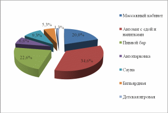 Большинство гостей 34,6% хотели бы видеть в гостинице автомат с едой и напитками, которые бы предоставляли возможность быстро и недорого перекусить в любое время суток. 22,6% предпочитают видеть пивной бар, так как основные потребители услуг данной гостиницы это командировочные, то мужчины после рабочего дня хотели бы выпить пива. А в связи с законом об алкогольной продукции спиртные напитки не продают после 19 часов вечера. 20% опрошенных предпочли массажный кабинет, что предоставило бы возможность расслабиться после рабочего дня. 9,3% хотели бы посетить сауну, что тоже предоставило бы возможность отдохнуть. 6,6% хотели бы воспользоваться автопарковкой, если бы она была в гостинице. Такой маленький процент объясняется тем, что основной контингент это командировочные, а они все приезжие люди и не имеют своих автомобилей в городе. 5,3% предпочли бы посетить бильярдную, можно сказать, что людей увлекающихся бильярдом не много. И всего 1,3% из респондентов считают, что в данной гостинице не хватает детской игровой. Это объясняется тем, что семейных клиентов с детьми сравнительно мало останавливается в данной гостинице.