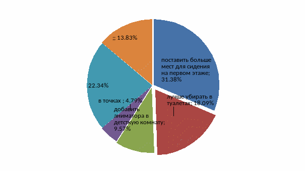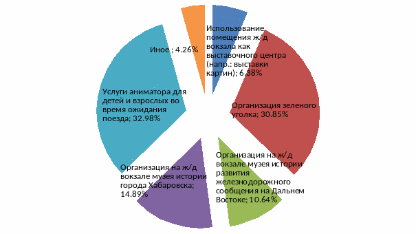 Услуги, которые были предложены пассажирам в анкете, потребители распределили для себя в порядке значимости, и самыми востребованными услугами оказались необходимость аниматора для детей и взрослых во время ожидания поезда (33%) и организация зеленого уголка и зоны отдыха(31%) (см. рис 2.7).
