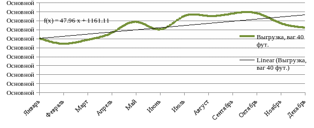 В данном случае задачей будет являться экстраполяция общих закономерностей на перспективный период и определение объемов выгрузки, погрузки грузов в крупнотоннажных контейнерах в июле 2015 года. Благодаря ей, возможно, осуществить описание некоторого общего будущего развития объекта прогнозирования на основе относительно небольшого объема информации, а также простоты и ясности принятых допущений. Причем, если развитие в прошлом носило скачкообразный характер, то при достаточно продолжительном периоде наблюдений скачки оказываются "зафиксированными" в самом тренде. Основная тенденция развития данного процесса или детерминированная величина определена по формуле (3.1). Требуется определить случайную компоненту, а затем осуществить экстраполяцию.
