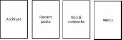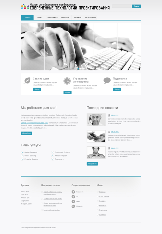 In the footer of this web portal so-called widgets will be placed – functional blocks displaying some kind of information. Widgets are easy to configure and may be changed in accordance to requirements to web portal. In this web portal will be displayed widgets such as «Archives» (allows to look through news of the established period of time), «Recent posts» (this widget displays recent articles added on site), «Social networks» (in this block there are links on pages of various social networks groups representing this company) and «Manual menu» (which will duplicate the main menu in the header). Footer template is presented on drawing 2.3.