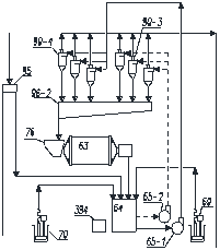 90-3, 90-4 - гидроциклоны CAVEX400CVX10; 96-2 – приемная ванна слива песков гидроциклонов; 76 – загрузка мельницы; 63 – шаровая мельница MHR 24004600; 64 – зумпф шаровой мельницы; 65-2, 65-1 – насосы перекачки; 69, 70 – оборотная вода