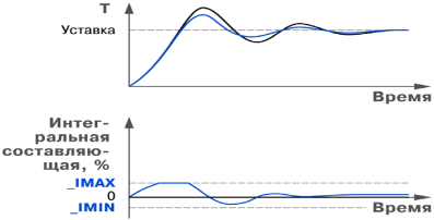 Во избежание «перерегулирования» и «недорегулирования» можно ограничить сверху и снизу значение накопленной интегральной составляющей. Ограничение накопления интегральной составляющей можно задать равное выходной мощности, необходимой для поддержания заданной уставки, определенной опытным путем. Максимальное ограничение необходимо задать на 5…15 % больше этой мощности, а минимальное – на 5…15 % меньше требуемой мощности.