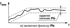 Следует иметь в виду, что чем больше значение полосы фильтра, тем лучше помехозащищенность измерительного канала, но при этом (из-за возможных повторных измерений) хуже реакция прибора на быстрое фактическое изменение входного параметра. Поэтому при задании полосы фильтра следует учитывать максимальную скорость изменения контролируемой величины, а также установленную для данного датчика периодичность опроса. При необходимости данный фильтр может быть отключен установкой нулевого значения параметра Pb.