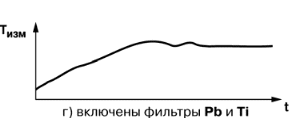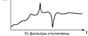 Если вычисленная разность превышает заданный предел, то производится повторное измерение, полученный результат отбрасывается, а значение полосы фильтра удваивается. В случае подтверждения нового значения фильтр перестраивается (т.е. полоса фильтра уменьшается до исходной) на новое стабильное состояние измеряемой величины. Такой алгоритм позволяет защитить прибор от воздействия единичных импульсных и коммутационных помех, возникающих на производстве при работе силового оборудования. Принцип действия поясняют графики на рисунках 2.6 и 2.7