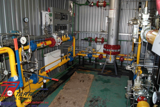 ГРС на магистральных газопроводах понижают начальное давление газа (например, 5 МН/м², то есть 50 кгс/см²) по одно-, двух- или трёхступенчатой схеме до 0,1 МН/м² и менее, на автоматических ГРС давление снижается с 5,5 до 3 ·10-2 МН/м²-, на газорегуляторных пунктах высокое давление (1,2 или 0,6 МН/м²) снижается до среднего (0,3 МН/м²) или низкого (300 мм вод.ст.). Технологическая схема ГРС включает все необходимые узлы и системы, укомплектованные современным оборудованием, в том числе: узел переключений, узел очистки газа и сбора конденсата, подогрева, редуцирования, замера, одоризации, подготовки газа для собственных нужд, подготовки теплоносителя, отопления. Измерение расхода газа в ГРС осуществляется турбинными или ротационными газосчетчиками, размещёнными на газопроводе среднего давления на выходе из ГРС. Температура газа измеряется показывающим термометром в диапазоне от −35 до +50 °C на входе в ГРС и на обоих линиях редуцирования за газовым счётчиком. На рисунке 1.3 изображен внутренний вид ГРС.[2]
