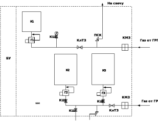 Рисунок 1.6 Упрощенная технологическая схема газоснабжения котельной УПГ ГРС-3; КШ–клапан шаровый; ББК – блок-бокс котельной; БУ – блок управления; К1..3– котлы подогрейные; Г1..3– газовые горелки котлов; КМЗ –клапан мембранный запорный; КлТЗ– клапан мембранный запорный; ПСК – предохранительный сбросной клапан
