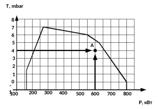 При выборе мощности в топке теплогенератора 600 кВт и аэродинамического сопротивления 4 мбара находится точка пересечения вертикальной линии, которая обозначает мощность в топке и горизонтальной, обозначающей интересующее нас значение аэродинамического давления. Горелка будет считаться подходящей только в том случае, если точка пересечения «А» двух прямых окажется внутри обведенного жирной линией контура диапазона горелки [21].