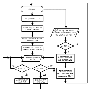 В начальный момент времени, при подаче питания, происходит выбор котла по принципу задействованной переменной N, которая в начальный момент равна 0, то есть задействована первая горелка. Принудительно сбрасываются дискретный выводы PA0, PA1, PA2 порта А микроконтроллера, отвечающие за подачу сигнала на включение котла. Далее следует задержка в 50 секунд, требуемая для инициализации АЦП микроконтроллера, а так же для выполнения процесса розжига горелкой и выхода на номинальный режим. После этого происходит проверка температуры в циркулирующем контуре, для датчиков Т1 и Т2 осуществляется параллельный опрос где сравниваются имеющиеся показания с константами записываемыми в энергонезависимую память, а именно для Т1 константа равна 85 градусов Цельсия, для Т2 – 60 градусов Цельсия. Если условие Т1>85 и Т2<60 не выполняются бесконечно, иначе происходит либо переключение горелки в режим малого горения, либо переход её в режим большого горения.