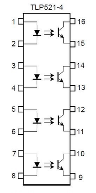 Для гальванической развязки и согласования мощности выходного сигнала принято решение использовать четырехканальную микросхему оптопарToshibaTLP-521-4 в корпусе DIP-16. Фототранзисторные оптопары расположенные внутри микросхемы TLP521-4 состоят из фототранзисторов, оптически соединенных внутри корпуса через арсенид галия с инфракрасным диодом, который испускает свечение. Микросхема обеспечивает четыре изолированных независимых канала.
