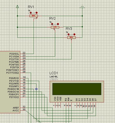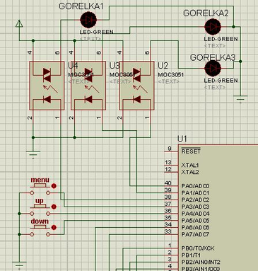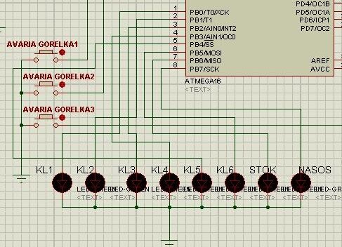 Для установки и изменения диапазона рабочих температур котла и давление в теплосистеме, предусмотрено меню установки температуры включения и отключения горелок, а так же диапазон давлений, при котором начинается подкачка или слив теплоносителя. На рисунке 6.3 изображено подключение в виртуальной модели к микроконтроллеру, а так же показано подключение гальванической развязки (оптопар) и имитирующие подачу сигналов на горелки (сигнальные светодиоды).