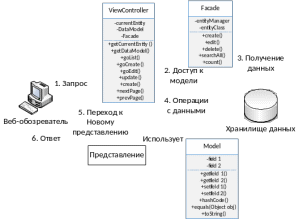 Для управления этими представлениями используется один контроллер – контроллер представления. Он в свою очередь связывается с другим контроллером – контроллером фасада модели, который ответственен за связь с моделью, хранящей информацию о сущности. В контроллере представлений осуществляется ссылка на реализацию каждого из методов, соответствующих операциям на представлениях, описанных в контроллере фасада модели [15].