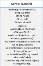 Метод перевода в строку перегружается таким образом, чтобы возвращать строковое представление и по сути краткое описание конкретной записи таблицы адресов, для этого вполне подойдёт конкатенация полей город, улица и дом. В некоторых ситуациях будут требоваться также метод сравнения. Этот метод автоматически вызывается в определённых ситуациях требующих сравнения записей или проверки принадлежности некоторого объекта типу сущности адресов. Для успешной работы метода сравнения требуется также перегрузить Метод получения хеш-кода просто возвращает значение, полученное как результат выполнения соответствующего метода типа Long, который генерирует хеш-код на основе идентификатора сущности [19].