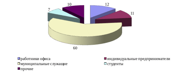 Из диаграммы следует сделать вывод, что наиболее частыми гостями кафе являются муниципальные служащие. Именно эти люди составляют группу постоянных гостей кафе, они образованны, интеллигентны, состоятельны. Они очень часто заказывают столики для проведения деловых встреч.