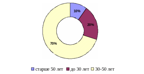 Как видно на диаграмме 70% посетителей приходится от 30 до 50 лет. Это постоянные посетители. Менее всего кафе посещают люди старше 50 лет, их 10%. Гости до 30 лет составляют 20% от общего числа посетителей.