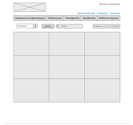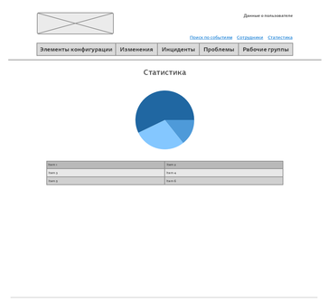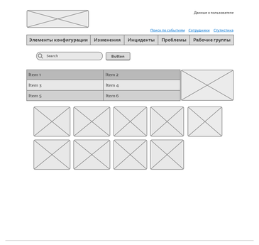 Визуальный интерфейс должен предоставлять возможность отображения таких страниц как «Главная» (поиск связанных элементов конфигурации), «Сотрудники», «Элементы конфигурации», «Изменения», «Инциденты», «Проблемы», «Рабочие группы», «Статистика».