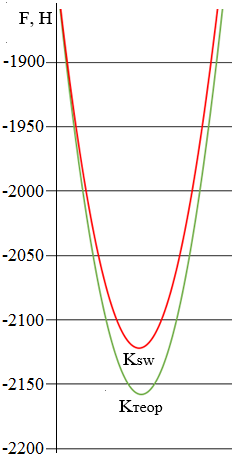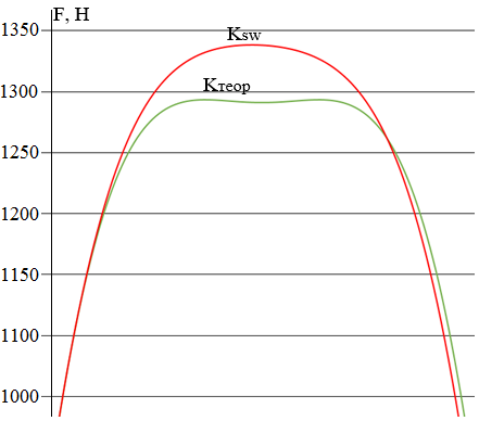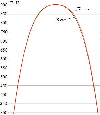 После расчёта теоретической и экспериментальной силы были сопоставлены их графики изменения для каждого сечения. Результаты для нижнего сечения представлены ниже на рисунках 2.18–2.20. Зелёным цветом обозначена теоретическая сила, а красным, полученная путём моделирования.