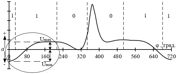 Так как выходной сигнал датчика выражается в вольтах, его необходимо преобразовать в размерность силы действующей вдоль шатуна и приложенной к центру поршневого пальца, а именно в ньютоны. Преобразование возможно выполнить, воспользовавшись переводным коэффициентом k. Данный коэффициент рассчитывается через амплитуду сигнала на участке газообмена. Для того чтобы определить нулевую линию графика необходимо к преобразованному сигналу добавить некоторую величину a, которая вычисляется через отношение ординат экстремальных точек на участке газообмена.
