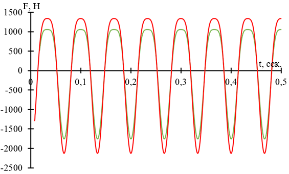 Можно заметить, что сила сжимающая шатун, то есть положительная часть графика, и сила, растягивающая шатун, отрицательная часть графика располагаются относительно оси абсцисс определённым образом. Данная гипотеза получает подтверждение в следующем подпункте.