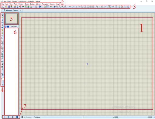 Вверху расположены пункты меню 2, предоставляющие пользователю полный набор возможных действий, имеющихся в Proteus 8.0. Под ним находятся кнопки верхней панели инструментов 3, позволяющие выполнять часто используемые команды. Слева расположена панель инструментов 4, с помощью которых проектируется принципиальная схема устройства. В левом верхнем углу рабочего пространства располагается окно предварительного просмотра 5, позволяющее оперативно перемещаться по схеме проекта. Под ним расположено информационное окно 6, в которое выводятся данные различного рода, в зависимости от того, какая из кнопок нажата на левой панели инструментов 4. В нижнем левом углу находятся четыре кнопки управления процессом моделирования 7: