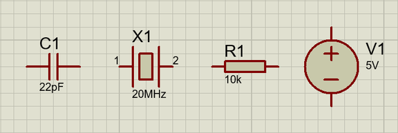 Рисунок 5.3 – Элементы схемы: С1 - конденсатор; Х1 - кварцевый резонатор; R1 - резистор; V1 - источник постоянного напряжения