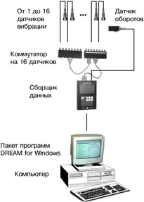 Диагностическая система «Dream for Windows» строится по модульному принципу, с возможностью ее расширения от простейшей переносной системы мониторинга до многоканальной стационарной системы мониторинга и диагностики с несколькими сотнями датчиков различных величин, установленных на контролируемом оборудовании. Основными элементами системы являются: