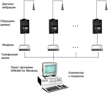Каждый из сборщиков должен иметь возможность на время передачи данных подключиться к телефонной линии связи через модем, а пакет программ Dream-32 должен быть укомплектован дополнительной программой управления сборщиками по стандартной линии связи без участия оператора. При таком расширении один специалист, не выезжая за пределы своего офиса, может осуществлять диагностическое обслуживание многих предприятий в разных городах и странах. В то же время, персоналу, производящему измерения и последующее обслуживание (ремонт) объектов диагностики необходимо иметь только сборщик данных с модемом, который по линии связи принимает не только маршрутные карты измерений, но и результаты диагностики вместе с рекомендациями по обслуживанию. Структура расширенной таким образом системы диагностики «Dream for Windows» приведена на рисунке 2.6.