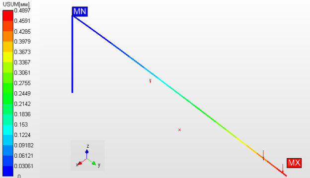 .Расположим на нём три силы вдоль оси Y, действующие от масс груза, захвата и шагового двигателя M3,(mгр+ mз) +mдв,в их центре масс, центры масс груза и захвата совпадают. В расчёте программа автоматически учитывает значение масс выбираемых профилей.Результатом расчёта является карта перемещений, рисунок 3.3 и диаграмма нагрузок, рисунок 3.4.