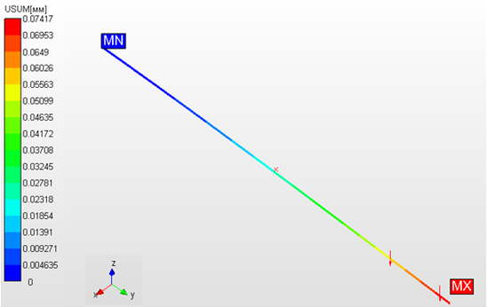 Из карты результатов перемещения видно, что перемещение в конечной точке составляет 0,074 мм, для нашего манипулятора ограничение допустимой величины обусловлено величиной допустимой погрешности. Полученное значение максимального перемещения удовлетворяет условием выбора сечения профиля.