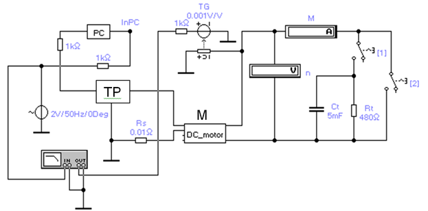 Рассмотрим схему исследования частотных характеристик контура обратной связи по частоте вращения (см. рисунок 4.8), где контур обратной связи составляет тахогенератор TG с коэффициентом передачи 1 mВ/(об/мин), (т. е. при номинальной частоте вращения вала 3000 об/мин напряжение на выходе генератора составит 3 В). Регулятор скорости РС (см. рисунок 4.9) построен аналогично ранее рассмотренному РТ. Здесь на усилителе А1 выполнен пропорционально-интегральный регулятор. Постоянная времени ТРС РС для обеспечения устойчивости САР выбирается из условия: ТРС > ТМ. При указанных величинах элементов постоянная времени РС составляет: ТРС = 20 с [15, 16].