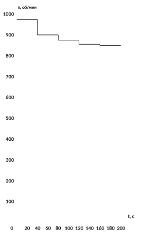 Из рисунков видно, что в равные промежутки времени механизм работает с установившейся скоростью п, развивая момент М. Первые 40 секунд скорость n = 975 об/мин, и момент М = 2,9 Нм. Следующие 40 секунд с изменением момента М на валу меняется скорость вращения якоря двигателя n. Длительность работы привода - 200 секунд.