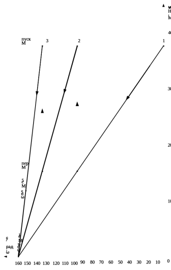 | Рисунок 1.6 Механические характеристики двигателя. 1-первая ступень пусковой характеристики; 2-вторая ступень пусковой характеристики; 3- рабочая характеристика. |