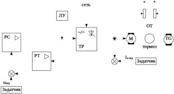 Служебный контур регулирования содержит управляемый (тиристорный) преобразователь (ТР), двигатель М, датчик тока с заданным значением Iaзад и регулятор тока (РТ).