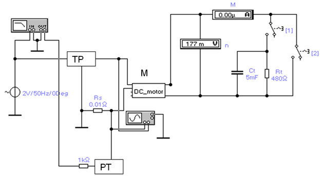 В качестве обратной связи в качестве задатчика значения тока якоря используется источник переменного тока; цепь обратной связи выход РТ – вход ТР отключена; входы анализатора спектра подключены: IN – к источнику переменного тока; AUT – к выходу РТ.