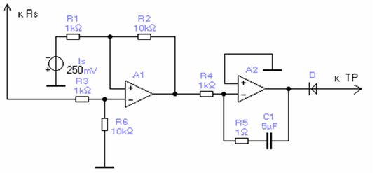 В приведённой модели тиристорный преобразователь TP, обладающий конечным быстродействием, согласно, работает на двигатель постоянного тока. Цепь обратной связи по току замыкается через измерительный токовый шунт Rs и регулятор тока РТ.