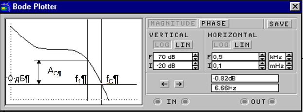где fc= 6,6 Гц; f1 = 3,6 Гц; φc = -290; Ас = 11,3 дБ.