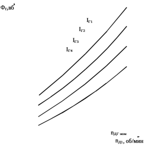 Требуемые характеристики ФГ(nДГ) образуют семейство кривых, как это показано на рисунке 2.10. Для разных дизелей форма и крутизна характеристики наибольшей экономичности существенно различны, однако во всех случаях магнитный поток тягового генератора должен увеличиваться при увеличении частоты вращения вала дизель-генератора. От крутизны кривой ФГ(nДГ) зависит степень использования свободной мощности дизеля и устойчивость системы регулирования частоты вращения вала дизель-генератора.