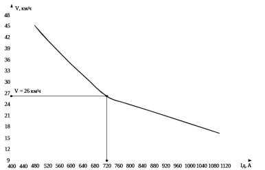 Электротяговая характеристика ТЭД в режиме возбуждения ПП типа ЭД – 118А зависимости V=f(I) показана на рисунке 3.4.