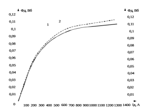 Рисунок 3.1 – Характеристики намагничивания тягового электродвигателя ЭД118А зависимости ФД=f(IД): 1 – универсальная; 2 – в режиме возбуждения ПП
