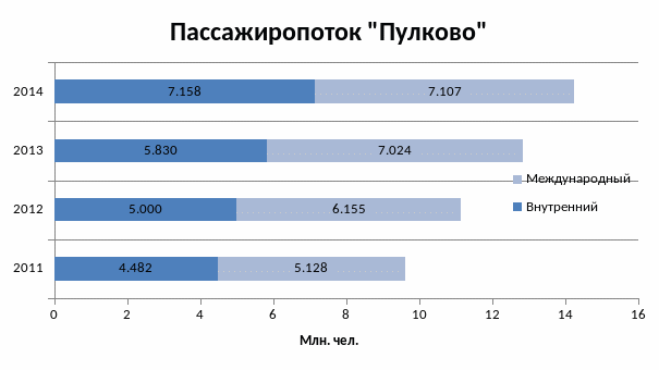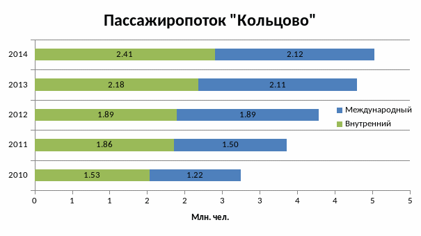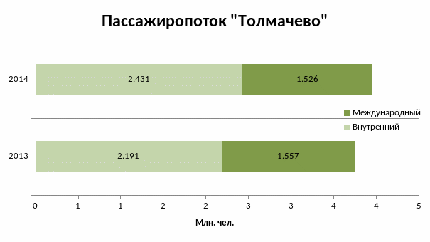Международный аэропорт Новосибирск (Толмачёво) по итогам работы в 2014 году обслужил 3 957 667 пассажиров, что на 5,6% больше, чем в 2013 году. Пассажиропоток на внутренних воздушных линиях составил 2 431 238 человек, на международных воздушных линиях — 1 526 429 человек (рисунок 1.7), что ниже, чем за 2013 г. Основной причиной снижения международного пассажиропотока стало падение покупательской способности россиян и девальвация рубля. По данным Росстата, за первые девять месяцев 2014 г. выездной турпоток из России снизился на 2% до 14,6 млн. человек, однако по европейским направлениям туроператоры по итогам года прогнозировали снижение на 40-50%.