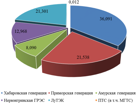 Наибольшая часть выработки электроэнергии приходится на филиал «Хабаровская генерация» (36,091%), включающий в себя семь электростанций, наименьшую часть электроэнергии производит филиал «Приморские тепловые сети» (0,012%).
