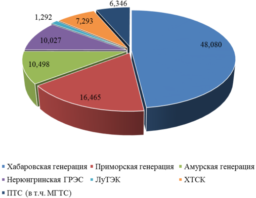 Наибольшую часть отпуска тепла производится филиалом «Хабаровская генерация» (48,08%), который включает в себя шесть теплоэлектростанций, одну гидроэлектростанцию и одну котельную. Наименьшую часть отпуска тепла производит филиал «Приморские тепловые сети» (1,292%).