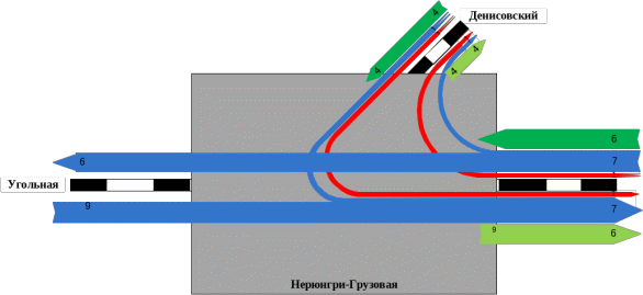 | Грузовые | Нерюнгри-Пассажирская | 6 | 6 | - | 12 | 12/1 | |