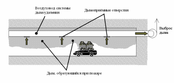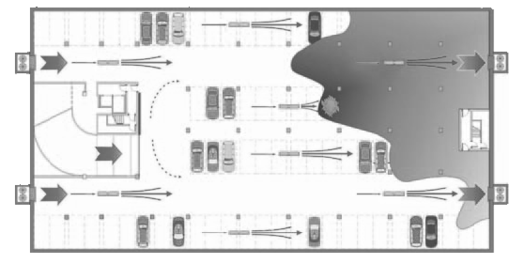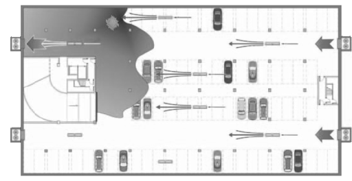 Рисунок 1.2 Принципиальная схема струйной противодымной вентиляции автостоянок.