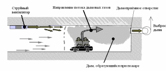 Подпотолочный слой дымовых газов перемещается посредством струйных вентиляторов. Применяются как осевые, так и радиальные вентиляторыпредставление на рисунок 1.4 и 1.5.