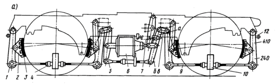 Тормозные колодки 3 чеками прикреплены к башмакам 2, которые соединены с подвесками 1. Подвески шарнирно закреплены к кронштейнам, приваренным на концевых брусьях рамы тележки или к кронштейнам, приваренным на боковинах рамы тележки. Через фигурные вырезы в нижней части подвесок проходят поперечины, попарно связанные с правой и левой внешних сторон каждой колесной пары тягами. Балансиры 5 внизу соединены тягами постоянной длины. Нижние отверстия в балансирах предусмотрены для перестановки тяги при оборудовании тормозной системы регуляторами выхода штока.