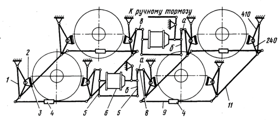 - рычажная передача должна обеспечивать равномерное распределение усилий по всем тормозным колодкам или накладкам;